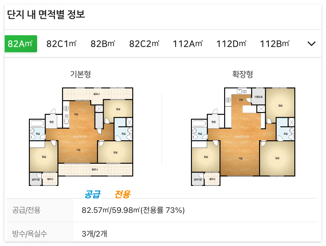 연세가 있으신 어르신의 경우 흔히 평형을 더 편하게 사용하시는데요. 우리가 흔히 말하는 평형이 바로 공급면적입니다. 서비스면적을 포함한 면적이니 같은 32평이라도 각각 사용하는 면적은 다르겠죠?